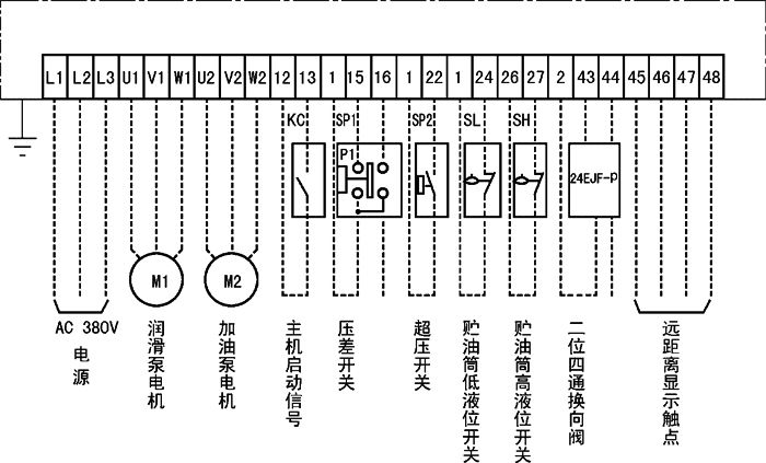 本控制箱能发出“供油时间延长”、“贮油筒空”、“超负荷运转”等故障信号。具有持续,手动和自动多种控制工作状态,可通过箱面上的转换开关来切换。持续工作状态:当润滑泵启动后持续地向系统两条主管线供送润滑脂;手动工作状态:当与主机联锁信号接通后,手动启动润滑泵运转向系统供送润滑脂,自动换向完成一个润滑周期供脂后自动停止;自动工作状态:当与主机联锁信号接通后,润滑泵按系统设定的时间间隔定时向系统供送润滑脂,完成一个润滑周期后自动停止。润滑泵不管在何种状态,一旦贮油筒空,补脂泵就会自动启动补脂,补满后自动停止。