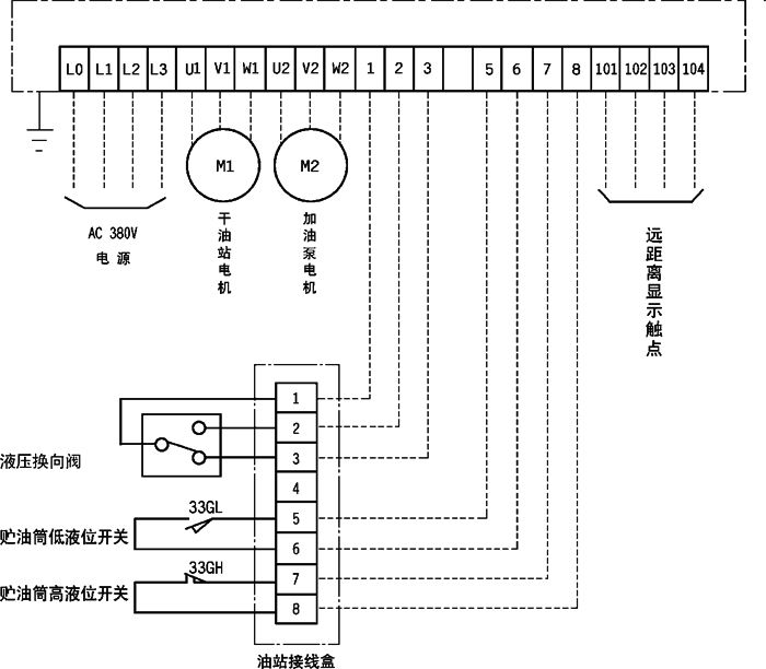 控制箱能发出“供油时间延长”、“加油泵超载”、“超负载运转”等故障信号。箱内设有一组外部接点,可向主机或主控室发送系统运转状况(停止、运转、故障)信号。