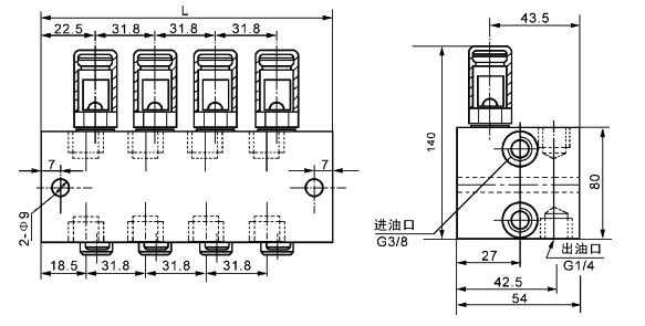 若需相应上下出口合并时,只需将上出油孔内的压紧螺塞用 6mm 内六角扳手拧出,取出分油套通孔向下装入,再 拧紧压紧螺塞,此时上出口用 G1/4 螺塞封堵以防灰尘侵入。