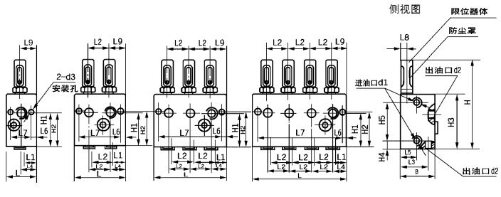 DSPQ-L系列单向出油的双线分配器,只在下面有出油口,活塞正向、反向排油时都由下出油口供送润滑脂。其形式与尺寸见图和表的规定。
