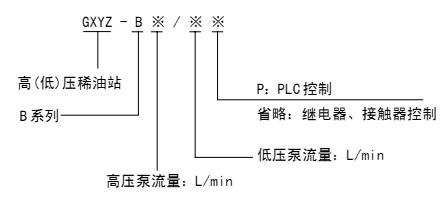 如采用 B 系列,高压流量为 20L/min;高压压力为 31.5MPa,低压供油压力为 0.4MPa;而低压供油量为 100L/min 的高(低)压稀油站,采用继电器、接触器控制的则按如下方法标注:GXYZ-B20/100