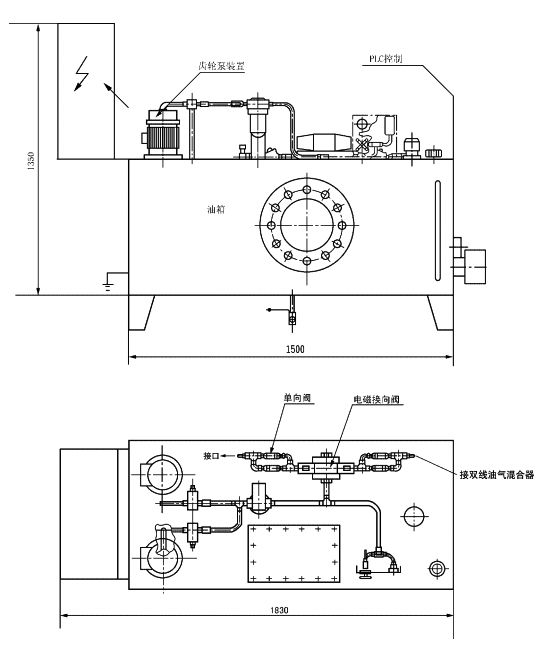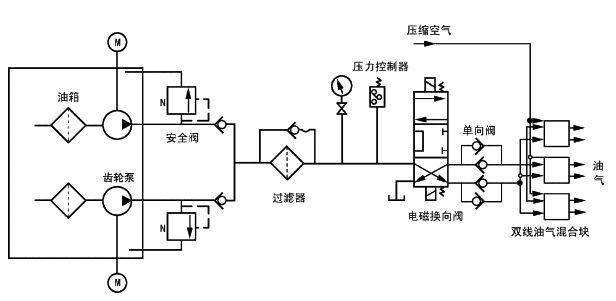 YQ-2型双线油气润滑装置为一种双线型系统,由油气站,空气操作盘和多个双线油气混合器组成。油气站包括齿轮泵、安全阀、过滤器、电磁换向阀和PLC电气控制柜,系统工作时,压力油经齿轮泵压出,经电磁换向阀进入油气混合块。油气混合块包括双线分配器和混合器两部分,油在分配器中被定量分配后压入混合器,在混合器中,定量的油在不间断压缩空气的作用下进入润滑点。双线分配器的两个进油口一个进油,则另一个回油,由电磁换向阀切换。