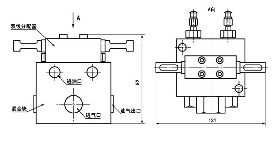 双线油气混合器由一个或多个双线分配器和一个混合块组成,油在分配器中定量分配后,通过不间断压缩空气进入润滑点。